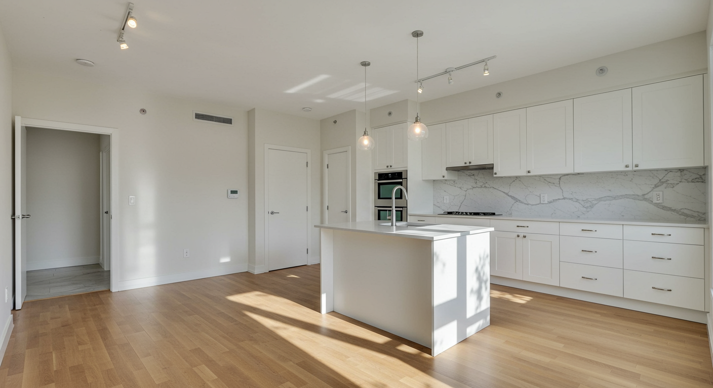 The unit, part of a stately condo built-in 1922, has an open floor plan with wide-plank-oak flooring and recessed lighting. The kitchen has white quartz counters, sleek white cabinets, a Carrara marble backsplash, and upgraded appliances. The bathrooms have marble tile flooring, marble walls, double-sink vanities, and modern fixtures.